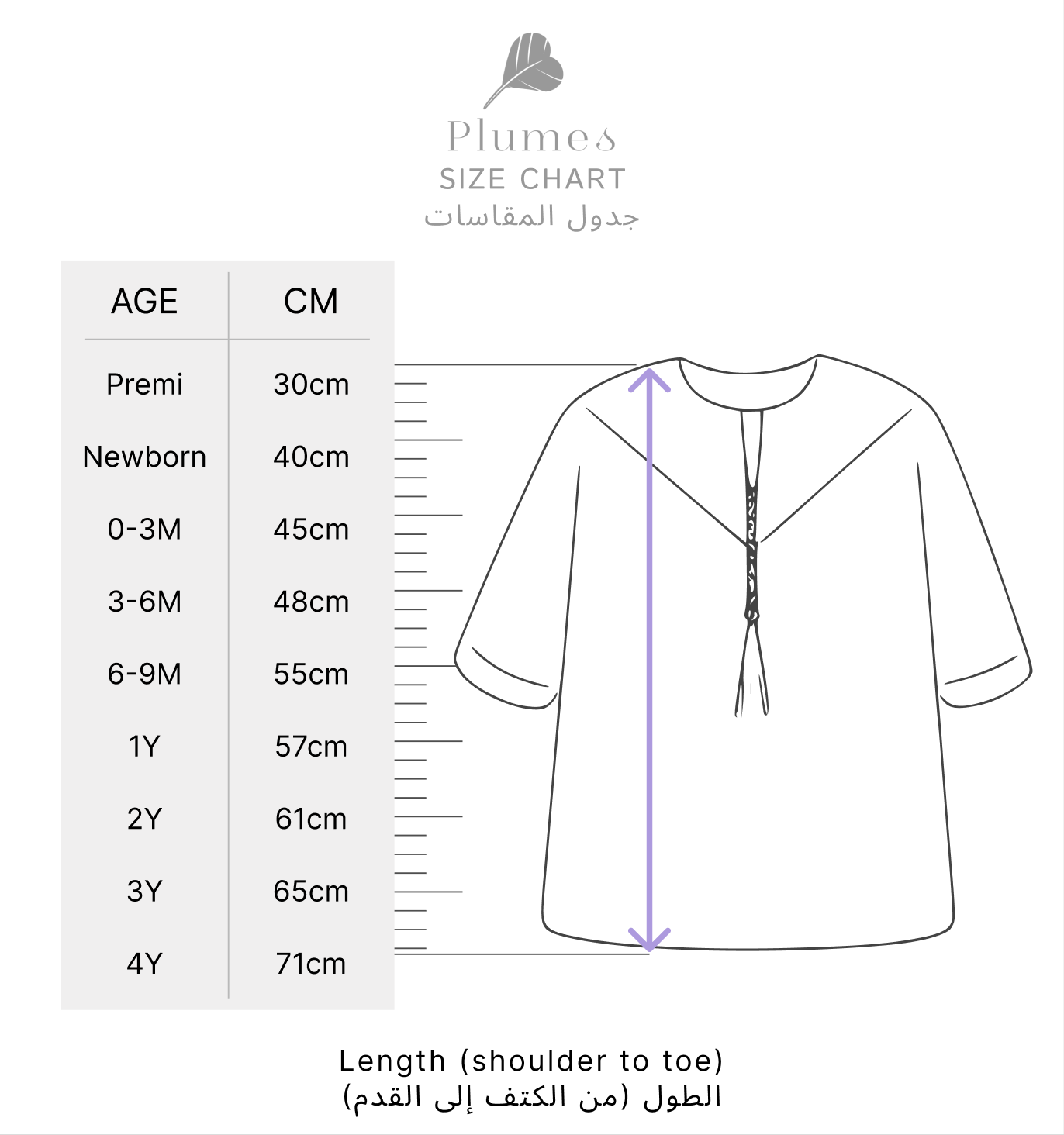 A premium white baby kandura made for all-day comfort—soft, breathable, and gentle on sensitive skin. Available in sizes 0–18 months. Pair it with our sandals, mittens, and tasbeeh to complete the set.